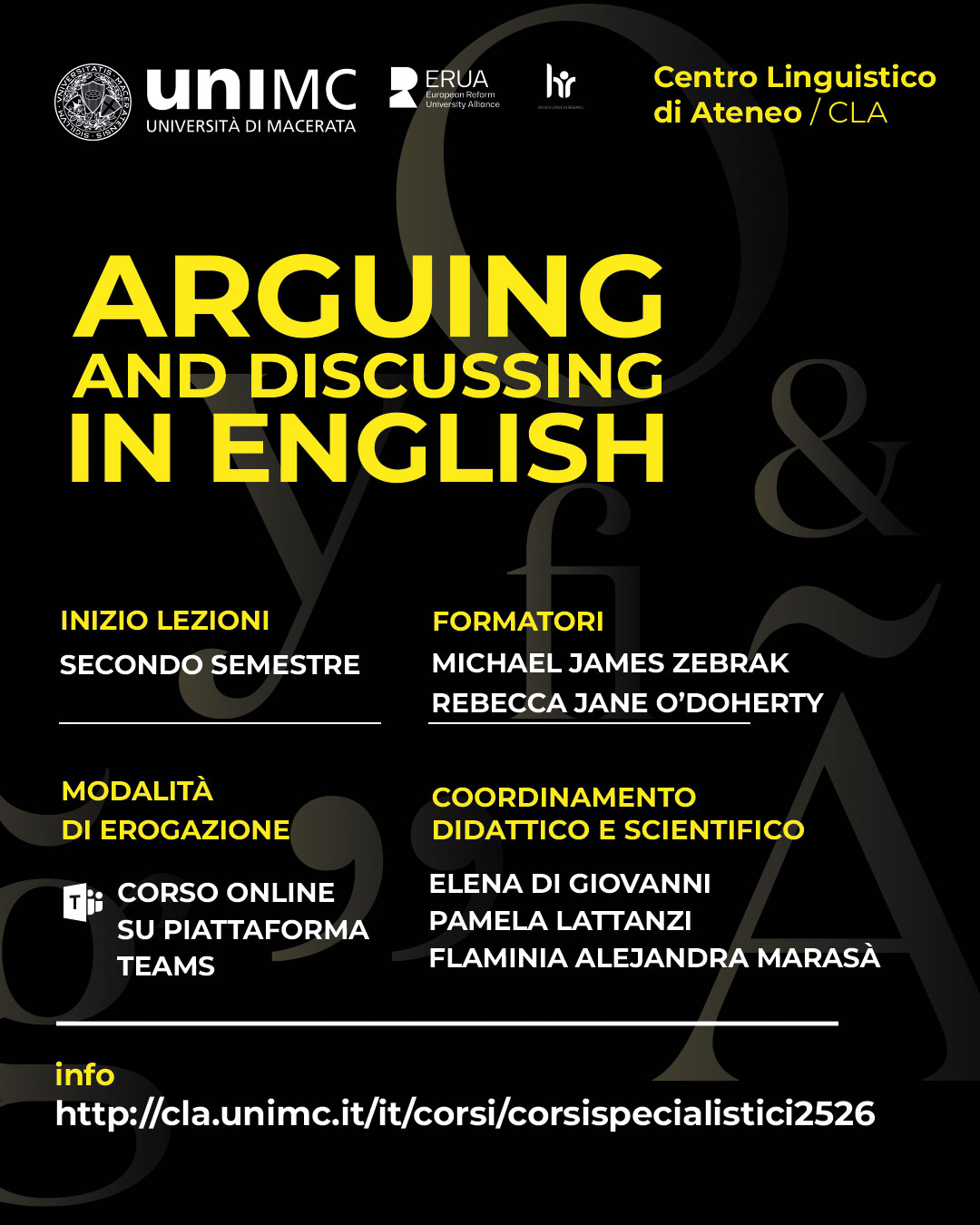 Contenuti del corso "Arguing and Discussing in English": The course offers theoretical and practical insight into the nature of argumentation - both eristic (concerned with winning) and dialectic (arriving at a mutually-satisfying compromise). Aristotelian rhetoric and the Toulmin method will be explored as eristic approaches, while the Rogerian method will be studied as a dialectic tool to negotiate a shared outcome. It then builds upon this theoretical foundation to introduce the students to the practical work of leveraging critical thinking to construct and present arguments on topical questions of fact, value, and policy, using the three methods in question.