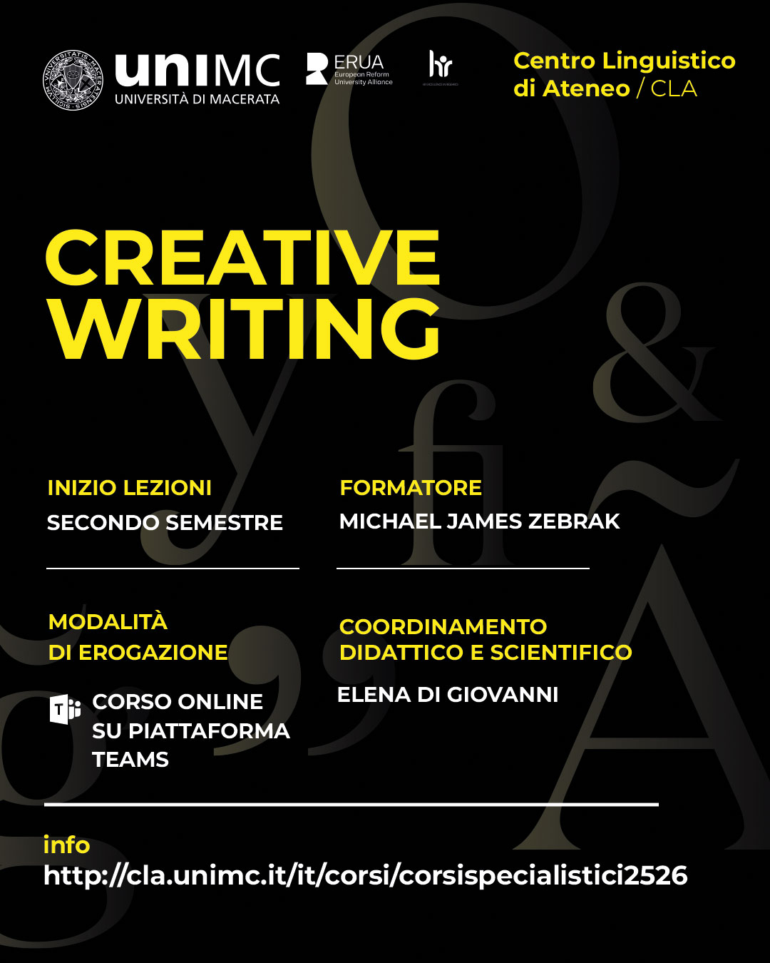 Contenuti del corso "Creative Writing": The course will focus on the fundamentals of creative writing. Beginning with the key elements of a great story, the class will then explore the topics of character development, plot development, dialogue, exposition, point of view, theme and motif, pace, voice, and suspense. The course will feature in-class workshops for brainstorming ideas for characters, plots and themes while also giving students time to work on their writing skills. During the course, students will be asked to develop, write and present parts of a short story, a prologue or a first chapter (their choice). Class time will be used to analyze and critique student submissions. This writing process will culminate in a final submission at the end of the course.