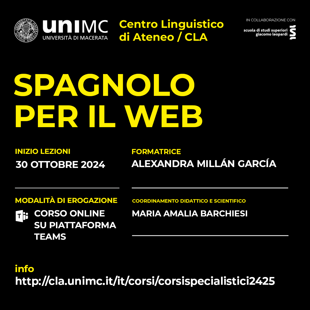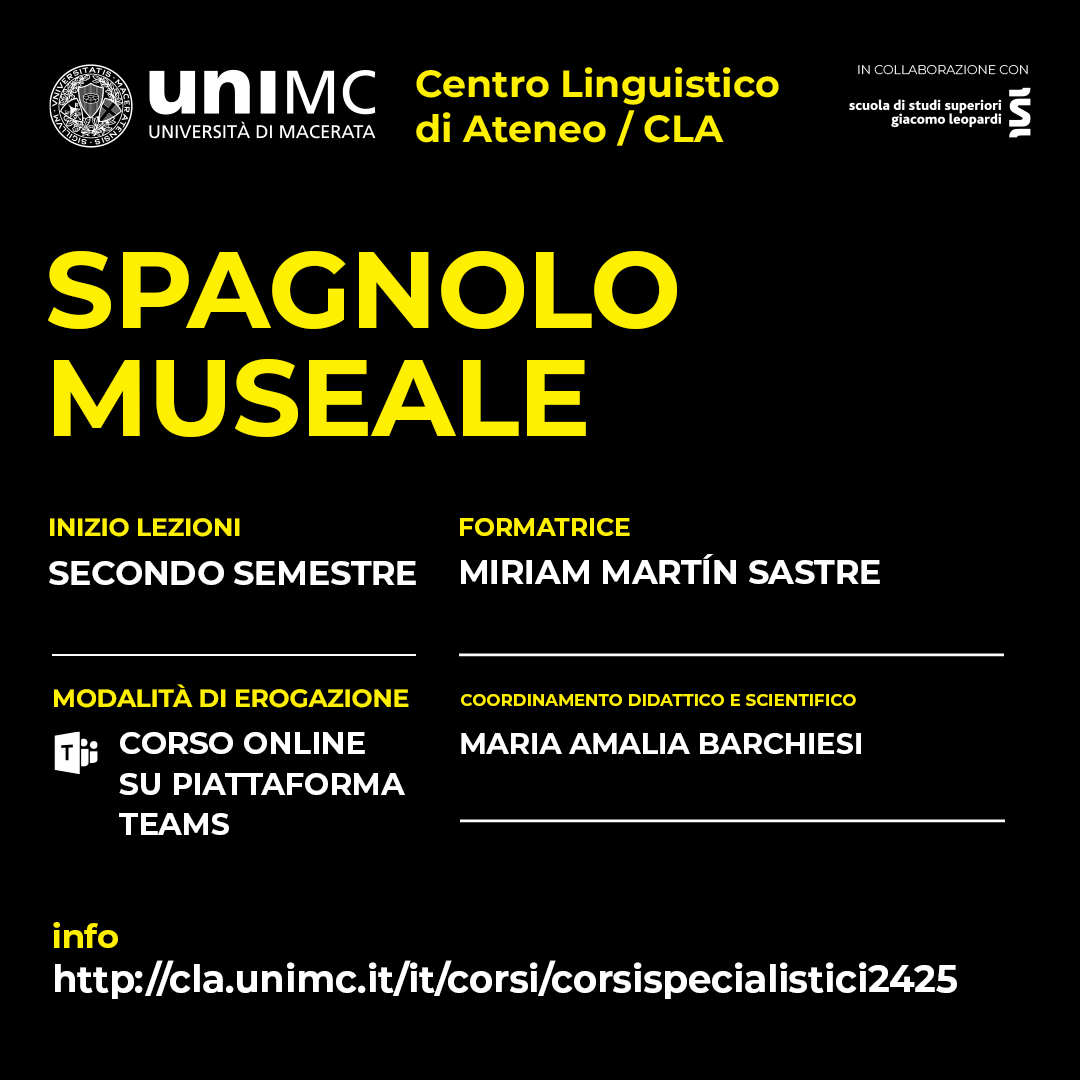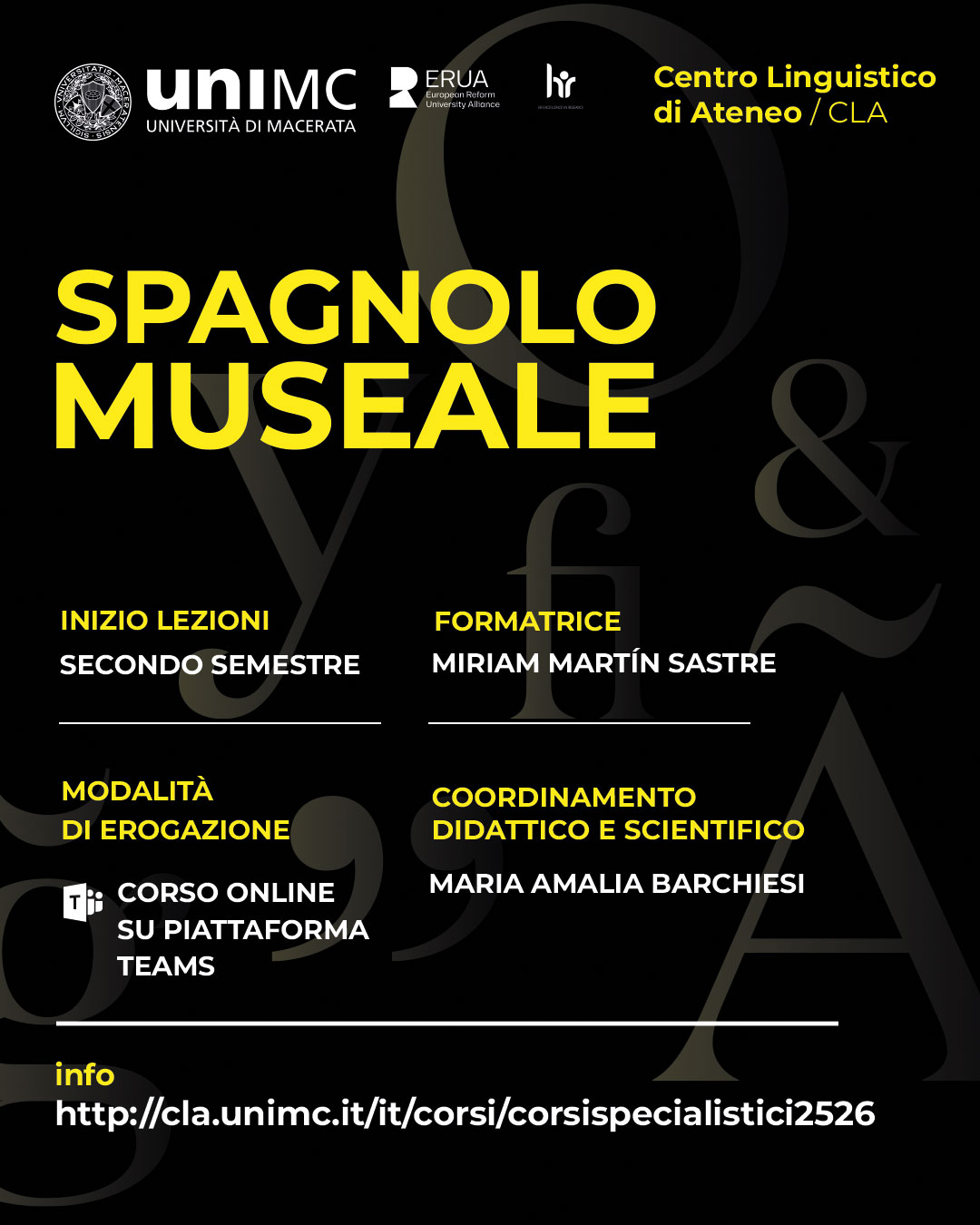 Contenuti del corso "Spagnolo museale": il corso mira ad analizzare le principali manifestazioni artistiche presenti all'interno dell'attività museale e il lessico che caratterizza tale ambito disciplinare, oltre che a descrivere parti, attori coinvolti e organizzazione di un museo. Le correnti artistiche più ricorrenti e affermate fungeranno da background alla stesura di un vocabolario tecnico del settore, attraverso il quale lo studente sarà in grado di individuare, descrivere e analizzare efficacemente le principali caratteristiche e sfumature di un'opera artistica. Lavori di gruppo e contenuti e mezzi multimediali faranno da supporto alla didattica. Il livello minimo richiesto per i partecipanti sarà equivalente al B1 del QCER (Quadro comune di riferimento per la conoscenza delle lingue).